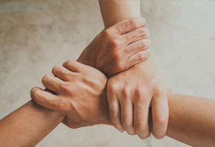 *De handen (ingebed) reiken naar elkaar en geven zo het geloof handen en voeten.